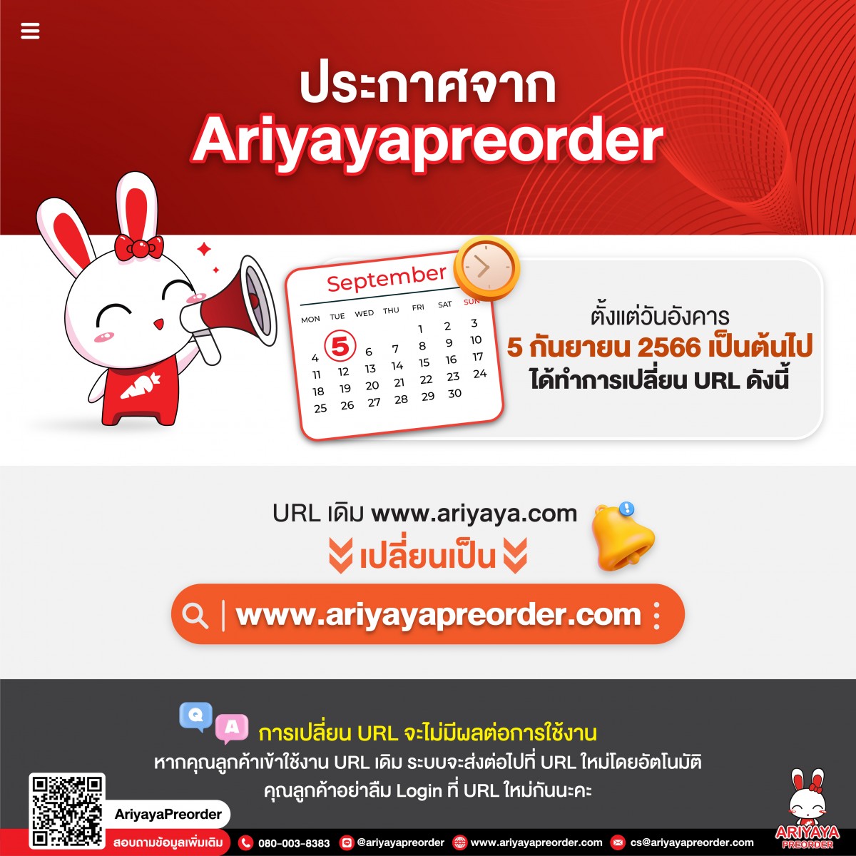 ประกาศแจ้ง บริษัทฯเปลี่ยน URL เป็นwww.ariyayapreorder.com