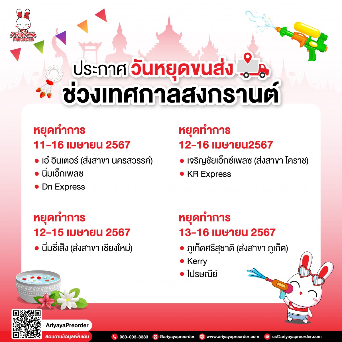 เนื่องจากเป็นช่วงเทศกาลสงกรานต์ ทาง Ariyayapreorder ขอหยุดทำการของรถขนส่งสินค้ามา ณ ที่นี้ด้วยค่ะ