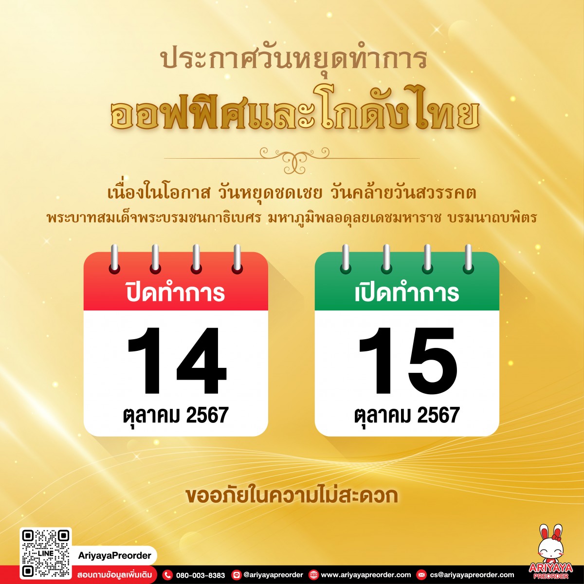 ออฟฟิศและโกดังไทยปิดทำการในวันที่ 14 ตุลาคม และ จะเปิดให้ทำการในวันที่ 15 ตุลาคม