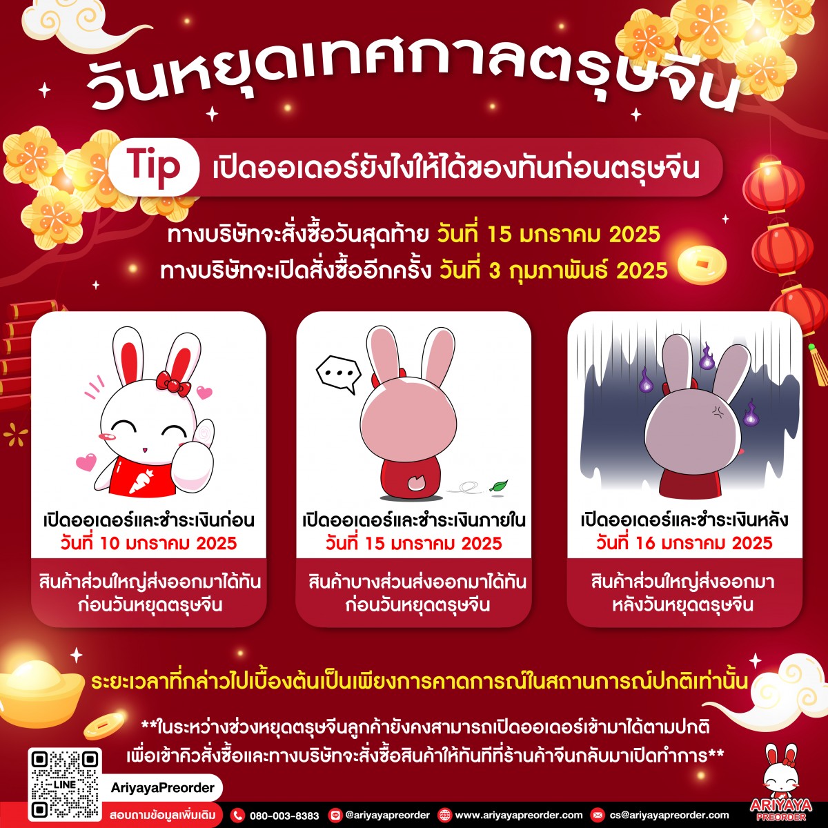 - เปิดออเดอร์และชำระเงินภายใน วันที่ 15 มกราคม 2025 *สินค้าบางส่วนส่งออกมาได้ทันก่อนวันหยุดตรุษจีน*