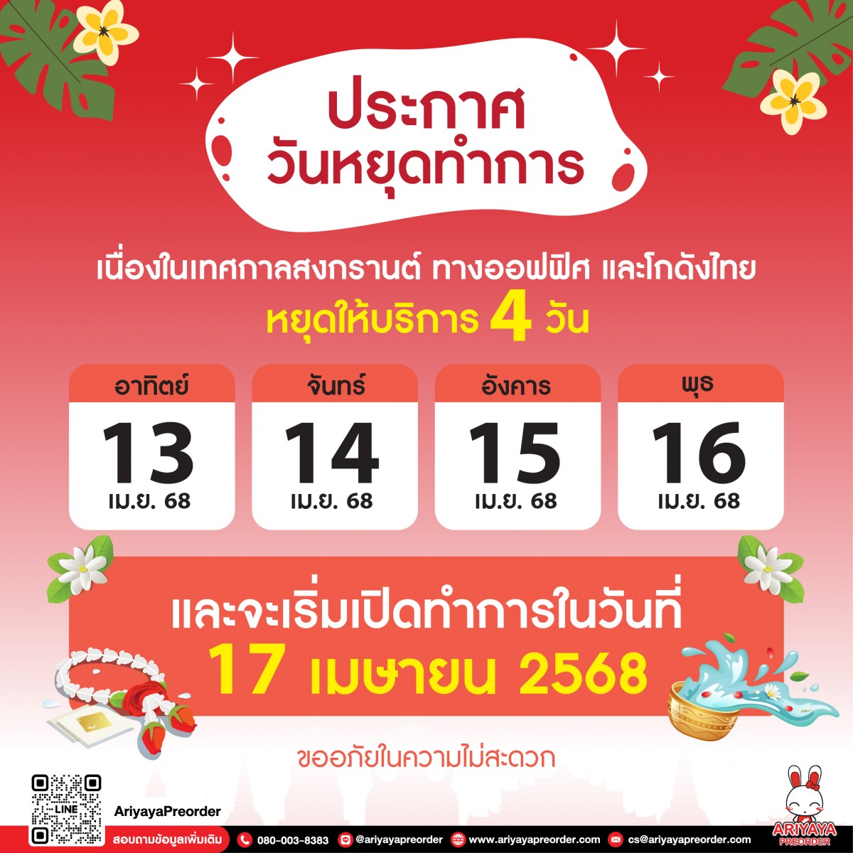 เนื่องจากเป็นวันหยุดเทศกาลสงกรานต์ ทาง ARIYAYAPERORDER จึงขอหยุดทำการตั้งแต่วันที่ 13-16 เมษายน 2568 และ จะเริ่มเปิดบริการในวันที่ 17 เมษายน 2568