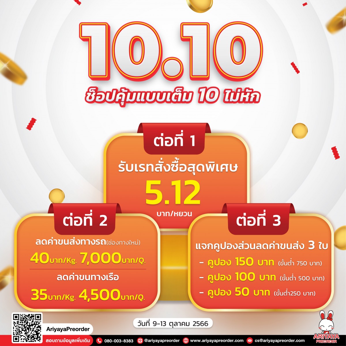 1. สำหรับลูกค้าที่เปิดออเดอร์ ภายในวันที่ 9-13 ตุลาคม 2566 จะได้รับคูปองส่วนลดค่าขนส่ง จีน-ไทย 3 ใบ