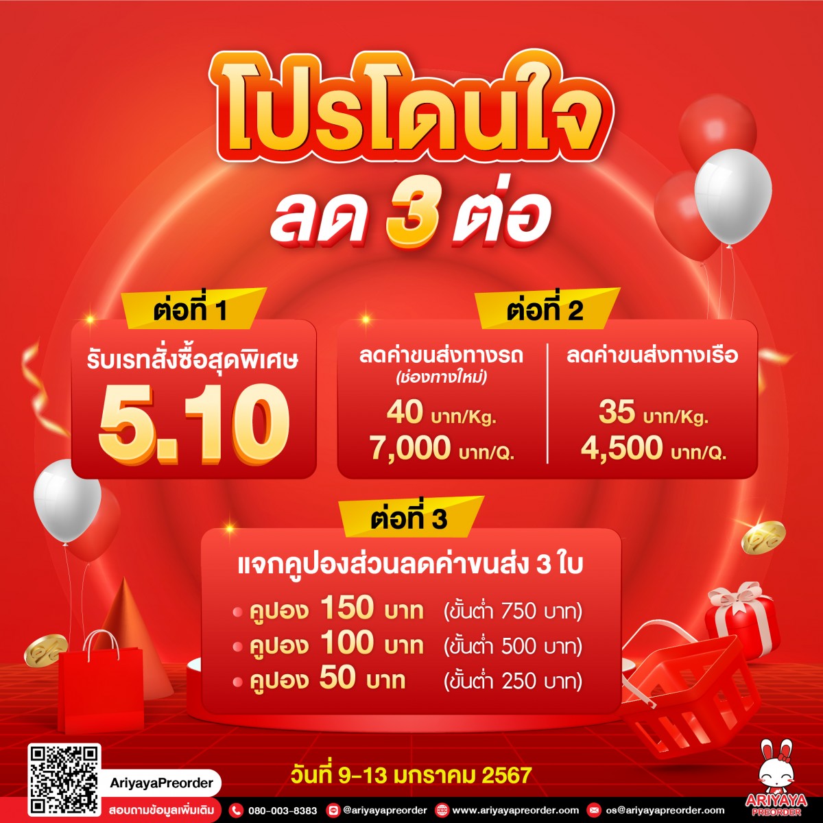 1. สำหรับลูกค้าที่เปิดออเดอร์ ภายในวันที่ 9-13 มกราคม 2567 จะได้รับคูปองส่วนลดค่าขนส่ง จีน-ไทย 3 ใบ