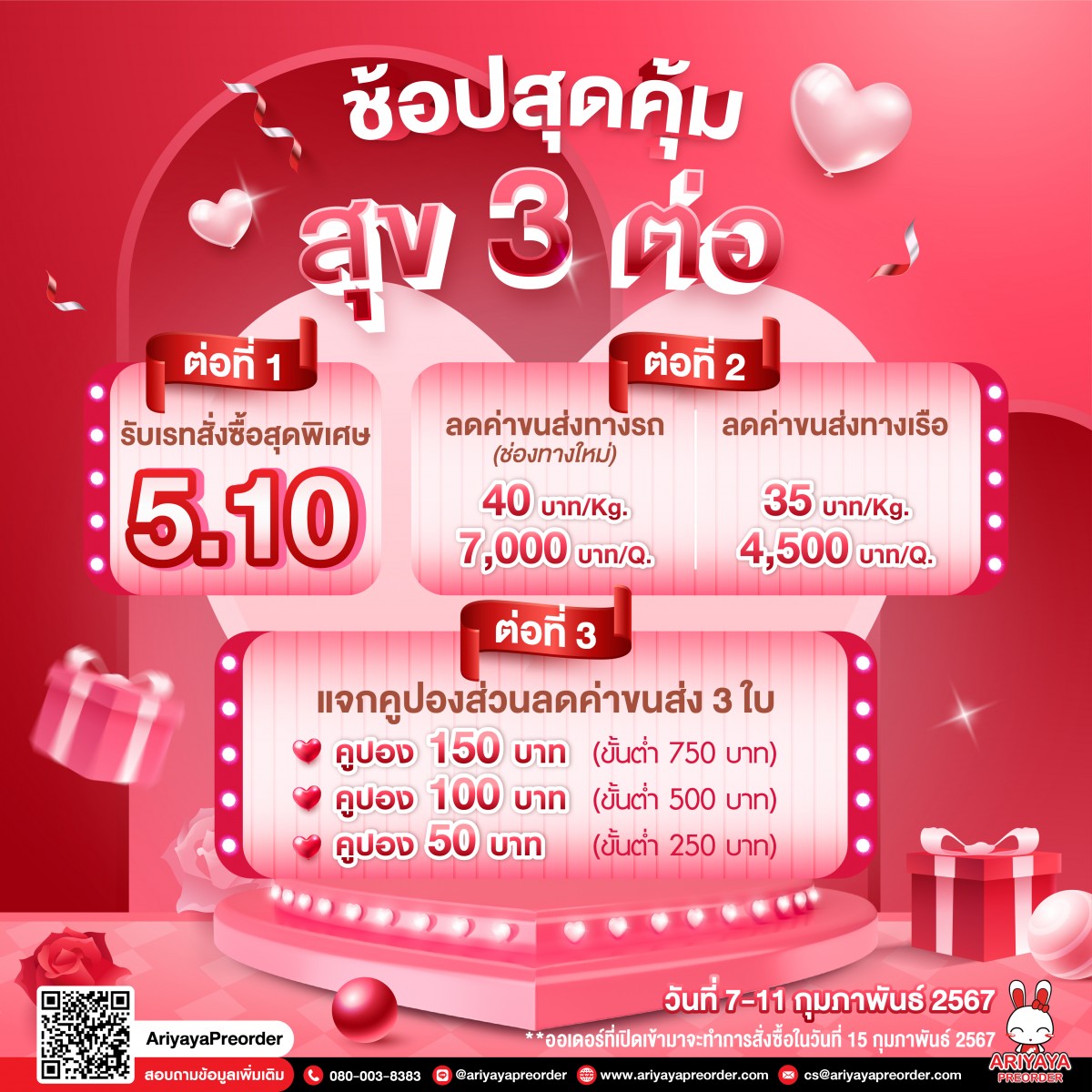 2.2 วันสุดท้ายของกิจกรรมโปรโมชั่น วันที่ 11 กุมภาพันธ์ 2567 ให้ตัดยอดชำระค่าสินค้าในออเดอร์ด้วยตนเองก่อน เวลา 18.00 น.