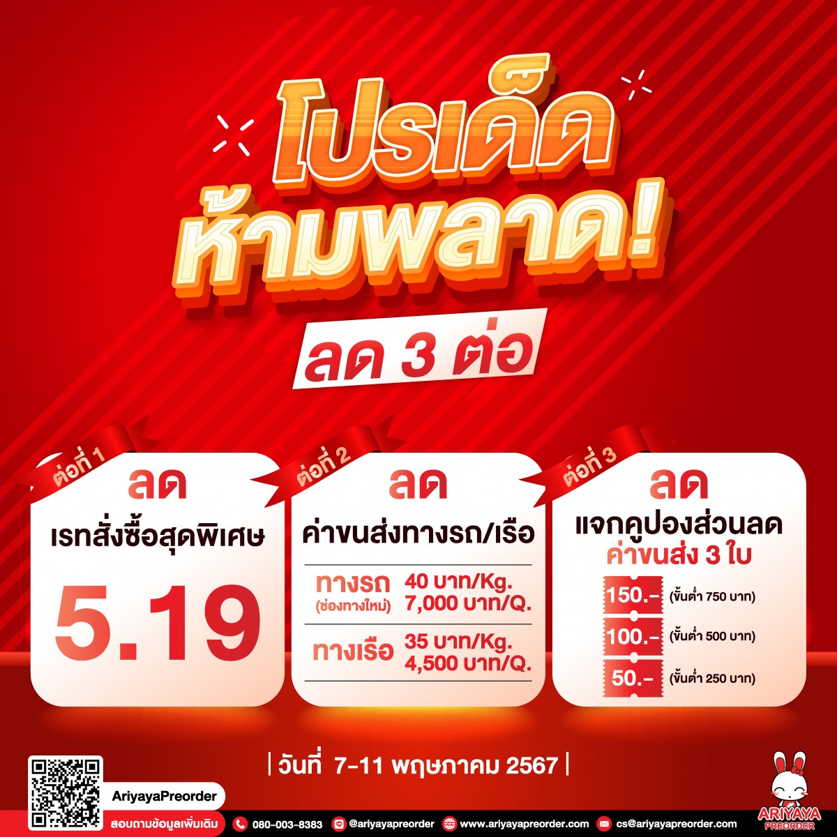 1. สำหรับลูกค้าที่เปิดออเดอร์ ภายในวันที่ 7-11 พฤษภาคม 2567 จะได้รับคูปองส่วนลดค่าขนส่ง จีน-ไทย 3 ใบ