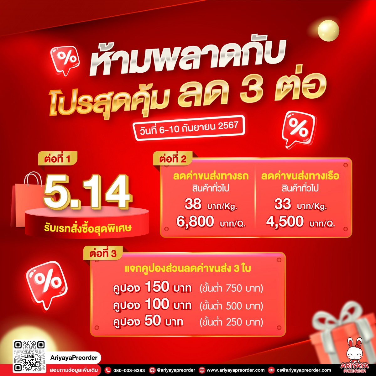 1. สำหรับลูกค้าที่เปิดออเดอร์ภายในวันที่ 6-10 กันยายน 2567 จะได้รับคูปองส่วนลดค่าขนส่ง จีน-ไทย 3 ใบ